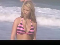 Sexy blond legal age teenager with outstanding body, great couple of titties and hawt abdomen in darksome and pink bikini at the beach.