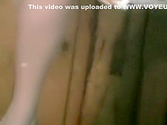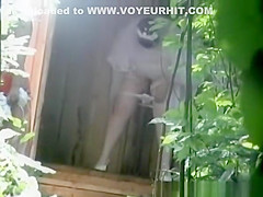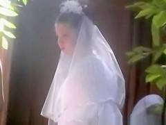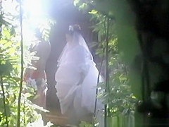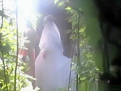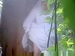 Bride caught lifting her wedding costume and pulling her silk pants down to take a pee in a wooden pee cabin.