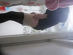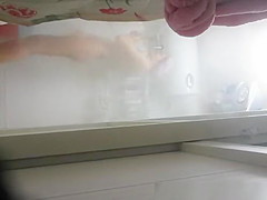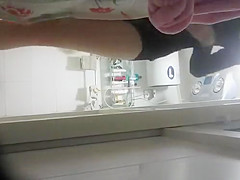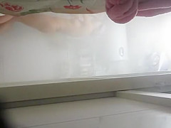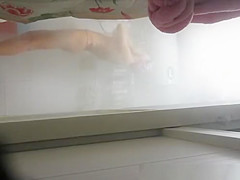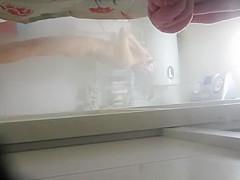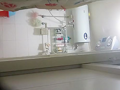 Hidden washroom camera catches woman undressing to wash her taut body with tattoos on her back.