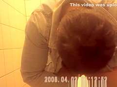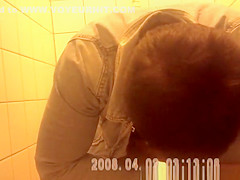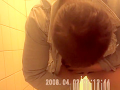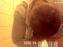 Woman pulls down her jeans panties to squat over water closet and take a urinate with her bulky vagina in advance of cleaning it.