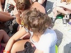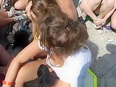 Dark Brown beauty in sunglasses and white top receives downblouse when that babe was sitting in the floor.