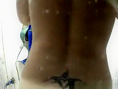 Low back tattoo on woman's body in the beach cabin. This Babe takes her bikini to wash her body and this babe has a good booty.