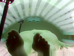 Spy camera in tanning room catches brunette hair babe taking off all her garments and entering tanning machine where that babe tans her bald slit and large wobblers body. After tanning this babe dresses her garments.