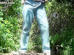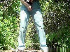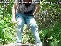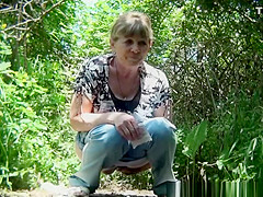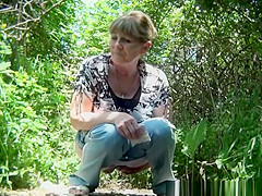 Aged woman caught in the woods squatting and pulling her cum-hole to void urine and clean it.