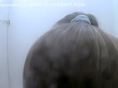 Woman with trimmed wet crack and fine scones spied changing her garments for bikini in beach cabin.