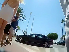 Hawt blond in short white suit walking in the sidewalk has her in nature's garb booty upskirted when wind lifts her suit.
