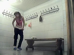 Curly bush legal age teenager drying her precious body with worthwhile milk sacks and dressing her clothing in locker room where other gals were likewise drying their bodies.