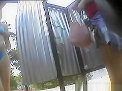 Bulky angel dresses in the dressing room on the beach in bathing costume and change your sanitary napkin.