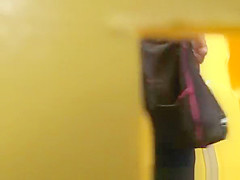 Woman pulls down her jeans panties and green pants to pee. After peeing that babe cleans her juicy curly twat.