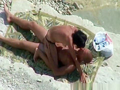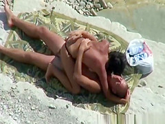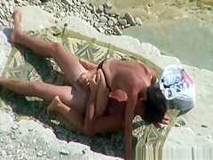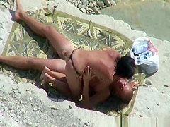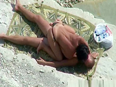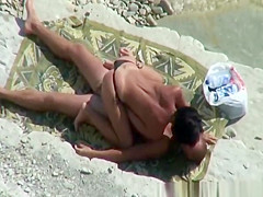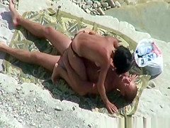Nudist pair relaxing in the sun playing with every others intimate parts, previous to woman pulls her bikini belt to the side and rides her mans large schlong untill that guy is not quite cumming.