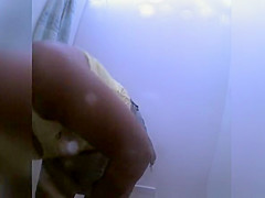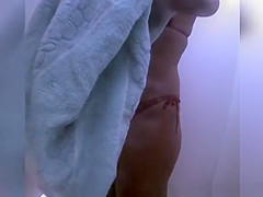 Woman spied in beach cabin taking off her red bikini and washing her body. After shower this babe dries it and dresses her raiment.