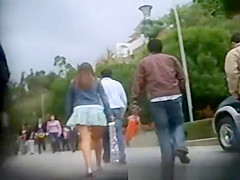 Description: Woman in short petticoat and jeans jacket receives her hot booty and white pants filmed by voyeur behind her.
