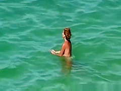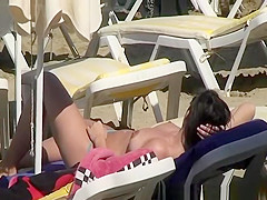 Voyeur films topless hotties in the water and sunbathing their bodies laid down on beach chairs.