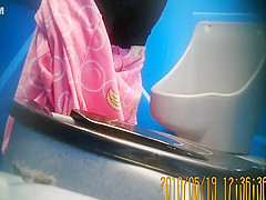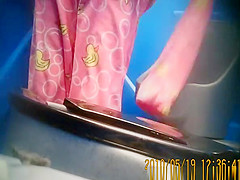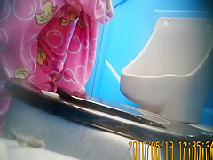 Description: Woman in pink outfit with yellow ducks over her darksome panties peeing in crapper.