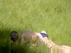 Old dude fucking his redhead shaggy wife missionary style outdoors in the grass.