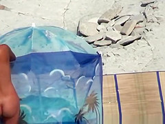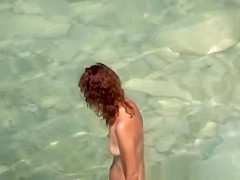 Petite mounds woman takes off her top and bikini bottom in rocky beach previous to refreshing her feet in the water.