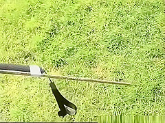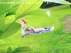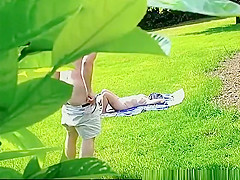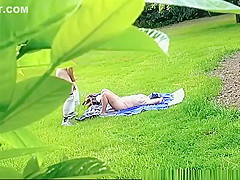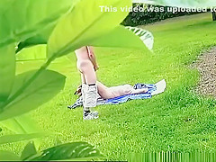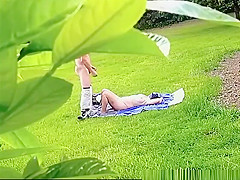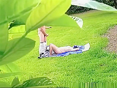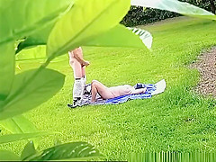 Woman sunbathing bare in the grass when stud approaches her out of that babe noticing and begins stroking his knob. This Guy wakes her up and this babe covers her self.