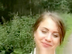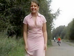 Description: legal age teenager show her goods off in a park whilst people are walking by