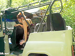 Hotty with plug in the a-hole positions for a lad at a public beach