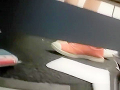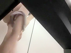 Angel in glasses caught by voyeur trying recent bikini in change room. This Babe tries 1st over her pants but resolves to remove 'em exposing her unshaved muff to the secret camera.