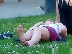 Look beneath the petticoat of a hotty lying on the grass.