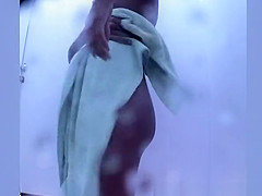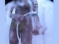 Fine body sweetheart in green bikini spied in beach cabin washing her body and taking it off in advance of drying with towel. After drying her petite love muffins and hairless cookie that babe dresses her garments.