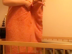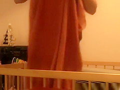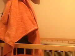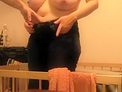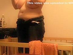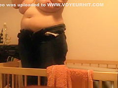 Obese large love bubbles wife with hirsute bawdy cleft spied after taking shower putting her darksome pants, panties and brassiere.