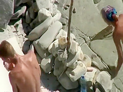 Lewd nudist gal sucks weenie from stranger boyz on the beach
