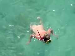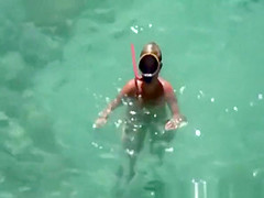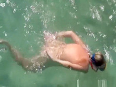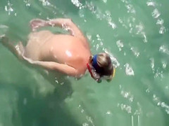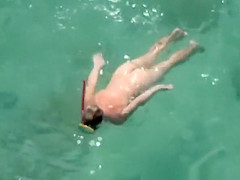 Description: Nudist woman swimming in the water with dive glasses inspecting the bottom.