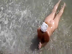 Aged nudist woman with petite scoops and overweight hairless snatch refreshes in the water and sunbathes her body. Her lascivious spouse joins her and bonks her wet crack whilst this babe rubs her love button.