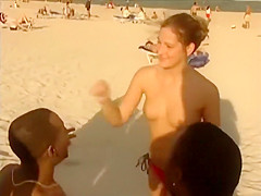 Lewd nudist gal sucks weenie from stranger boyz on the beach