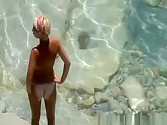 Short air blond nudist woman with bikini tan lines fingers her twat with her feet in the water. Her chap joins her and fingers her vagina also in advance of this babe seats on his knob and rides him.