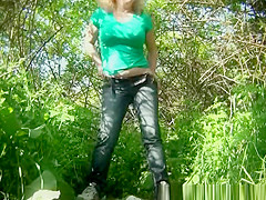 Breasty aged woman caught pulling down her constricted jeans panties and pissing next to some bushes.