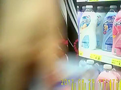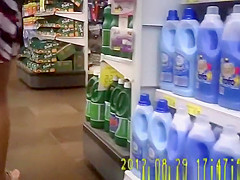 Exhibitionist woman in flip flops flashing in supermarket
