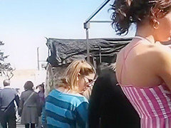 Description: Legal Age Teenager in constricted jeans panties trying fresh couple of shoes in a street market.