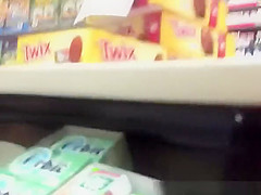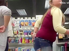 Description: Bulky legal age teenager in taut jeans shorts bent over store counter.