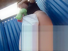 Hotty with plug in the a-hole positions for a lad at a public beach