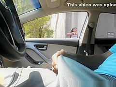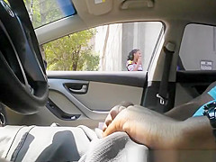 Stud takes out his darksome ramrod and plays with it inside his car flashing it to ebon and white woman talking in the sidewalk.