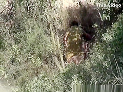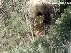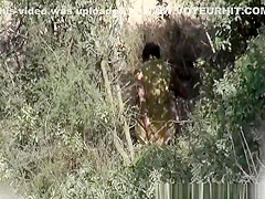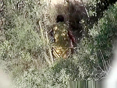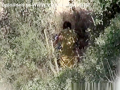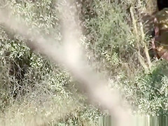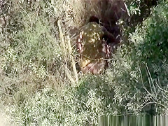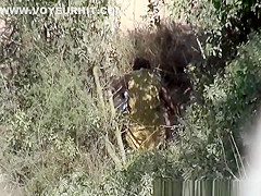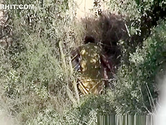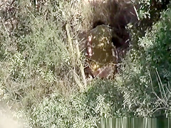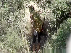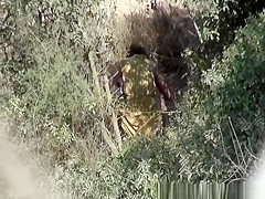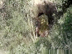 Woman pulls her constricted panties down and her costume up to squat and pee during the time that the voyeur hidden in the bushes films her.