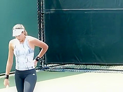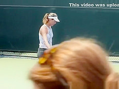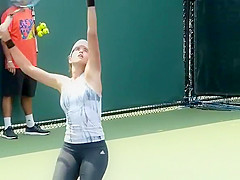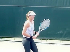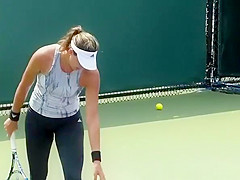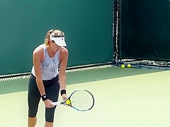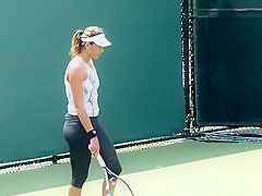 Description: Tennis player wearing spandex panties practicing tennis in the court.