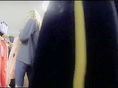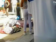 Lengthy hair blond legal age teenager in taut dark shorts at the clothing store and honey in white watch throughout leggings in busy street.