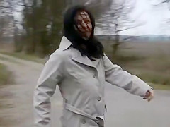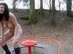 Exhibitionist wench brunette hair with tattooed body unbuttons her coat and shows off her body in public roads and park.