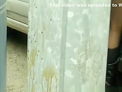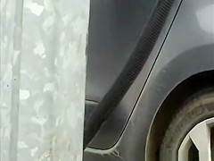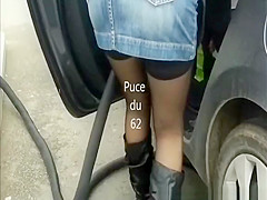 Woman in high heel darksome boots, hot dark nylons and short jeans petticoat upskirt on her hairless in nature's garb cookie during the time that vacuum cleaning her car.