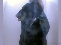 Woman in beach cabin takes off her green bikini exposing her priceless natural boobs and hairless muff previous to showering her body and drying it. That Babe then puts some panties and brassiere and dresses a short costume.