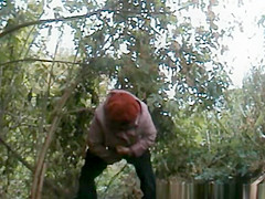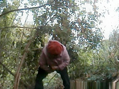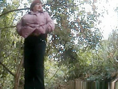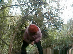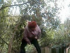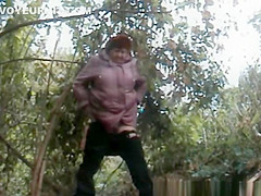 Plump granny caught pulling down her panties and pissing outdoors next to some bushes.