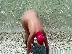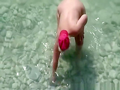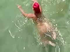 Corpulent aged nudist woman with red cap on her head with her muff beneath water stretching her backs previous to going to shore.