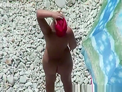 Plump aged nudist woman with red cap