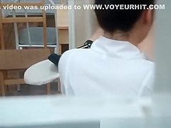 Voyeur films woman with her legs widen in the gynecologist chair having her hairless muff examined by female doctor.