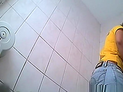 Cute playgirl in yellow t-shirt peeing in public crap-house. This Babe cleans her cum-hole and throw the ribald juicy paper into the basket not quite hitting the spy webcam.