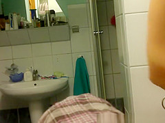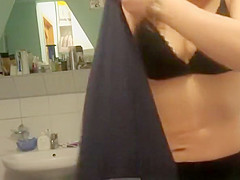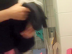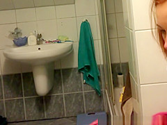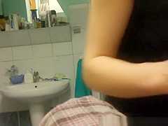 Hidden livecam in washroom catches redhead pulling down her pajama to pee and dressing her pants. This Babe brushes her teeth and dresses some dark garments.